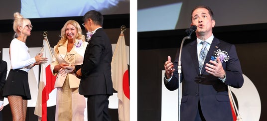 写真:功労賞授与の様子(左)、駐日ポーランド共和国大使スピーチ(右)の様子