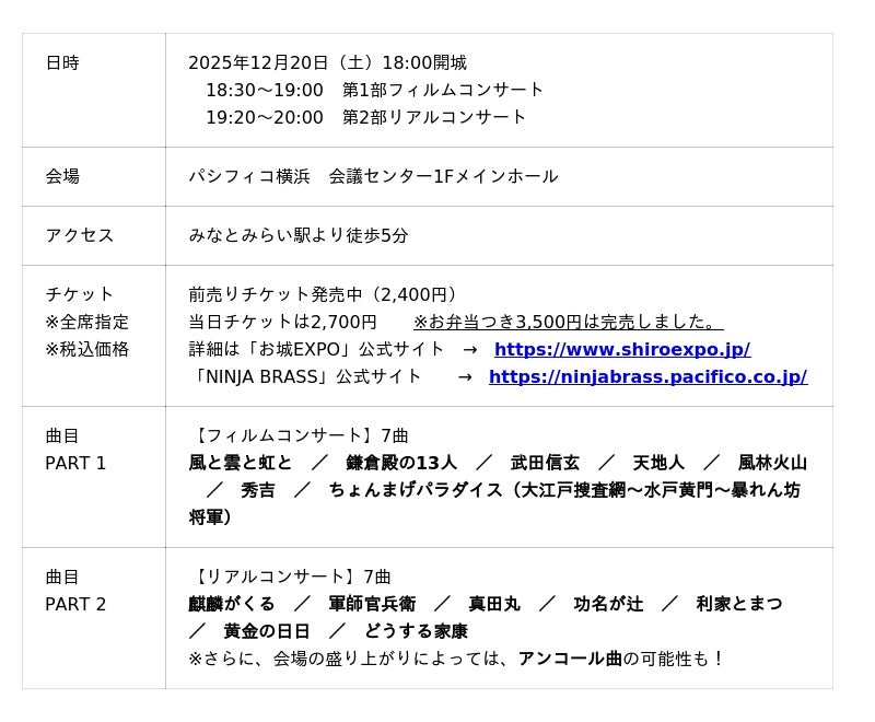 今年で10回目を迎える国内最大級のお城ファンの祭典「お城EXPO 2025」は、2025年12月20日(土)・21日(日)、パシフィコ横浜にて開催されますが、これに合わせて、初日の夜である20日(土)18時30分からは「サタデーナイトコンサート」が、パシフィコ横浜・会議センター メインホールで開催されます。お得な前売りチケットの発売は12月19日まで。ぜひ、お早めにお買い求めいただき、大河ドラマ・歴史ドラマのテーマ曲の演奏とパフォーマンスをお楽しみください。