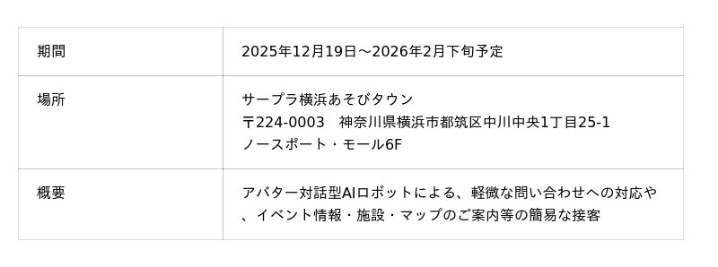 株式会社ナノコネクト(本社:兵庫県神戸市中央区、代表取締役:木島貴志、以下「ナノコネ」)の提供するおもてなしAIエージェント「LinKa」が、ゲームセンターでの接客の実証実験に採用されました。本実証実験は、株式会社サードプラネット(横浜本社:神奈川県横浜市、代表取締役社長:志野一夫、以下「サードプラネット」)と株式会社アイティーシム(本社:神奈川県横浜市都筑区、代表取締役:河内秀司、以下「アイティーシム」)が、アバター対話型AIロボットによる来店客の利便性向上とスタッフの業務品質向上を目指して行うもので、2025年12月19日から実施されます。
