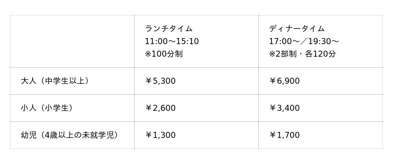 ※表示料金には消費税が含まれております。サービス料は頂いておりません。