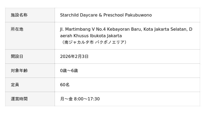 ヒューマンアカデミー株式会社の事業子会社で保育事業を展開するヒューマンスターチャイルド株式会社(本社:横浜市、代表取締役:川下 裕左、以下「当社」)は、ヒューマンホールディングス株式会社の子会社であるPT. HUMAN CITA ANANDA(本社:インドネシア・南ジャカルタ市、以下「HCA社」)が、インドネシア国内で2拠点目となる保育施設「Starchild Daycare & Preschool Pakubuwono」(以下「当園」)を、2026年2月3日(火)に開園したことをお知らせいたします。