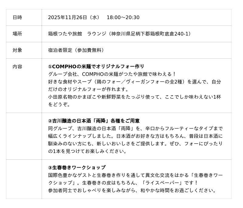 これを記念し、1126(「いい風呂の日」)に、日本の米文化を「食」と「交流」で楽しむ宿泊者向けイベント「お米deグッドナイト」を開催いたします。国内外のゲストが参加できる国際色豊かな催しで、シマダグループが掲げる「いい時間(とき)をつくる」理念を体現するものです。皆さまのご参加を心よりお待ちしております。
