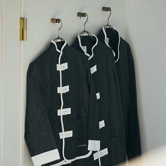 ルームウェアには人気パジャマブランド『NOWHAW』の"kung-fu" pajama をベースにしたTRAN.SCENDER(R) H??TEL別注モデル「カンフーパジャマ」をご用意。生地はオリジナル同様、柔らかく肌触りのよいコットン100%のベビーデニムで、カラーは通常のブルーデニムからブラックデニムへ。さらに、オリジナルモデルにはないキッズサイズも2種(100cm/130cm)ご用意しました。館内はもちろん、外での着用も可能で、温泉街での浴衣のように、中華街の景観にマッチした装いで街歩きをお楽しみいただけます。