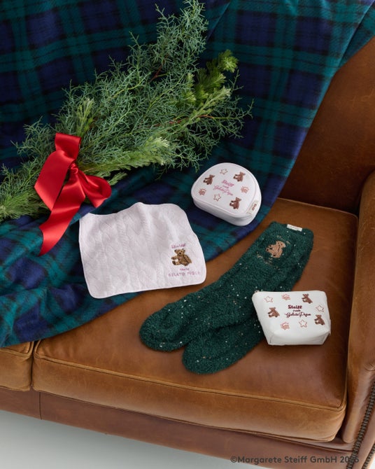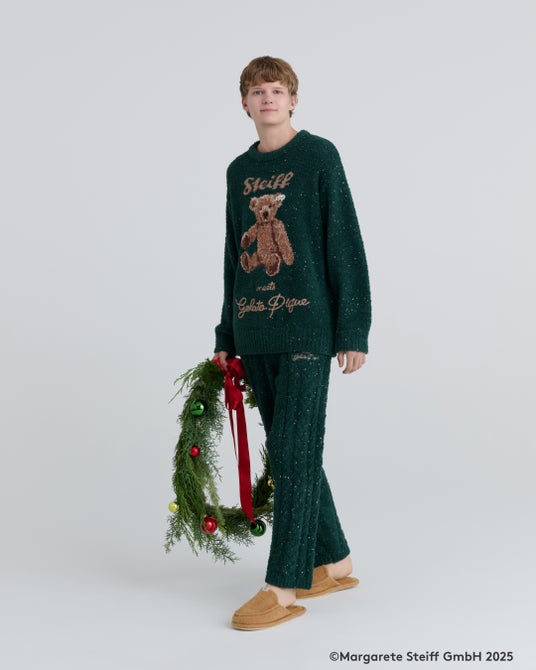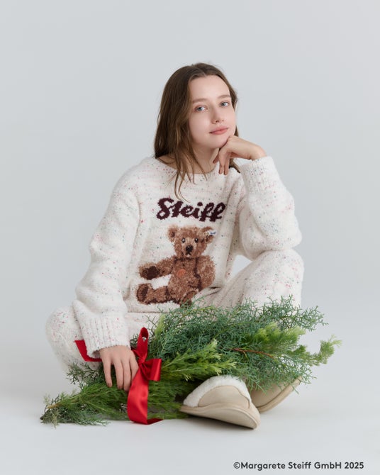 ふんわりとした肌触りとゆったりとした着心地に癒される、こだわりの詰まったニットシリーズ。クリスマスの甘いお菓子をイメージしたカラーネップ入りのプルオーバーは、1902年にSteiffが生み出した世界で最初のテディベア『55PB』のアートをデザイン。UNISEXサイズのジャガードカーディガンは、クリスマスらしいベアや、ドイツでクリスマスによく食べられている星型のお菓子をモチーフにしたオリジナルボタンがポイント。胸元にはロゴ刺繍を入れ、袖には温もり溢れるアラン模様をあしらいました。