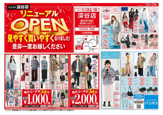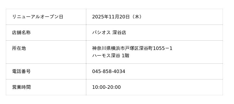 株式会社田原屋(本社所在地:神奈川県川崎市、代表取締役会長:田熊 太郎、代表取締役社長:甲斐 直裕)は、11/20(木)横浜市戸塚区のハーモス深谷1階に店舗を構える「パシオス深谷店」をリニューアルOPENいたします。