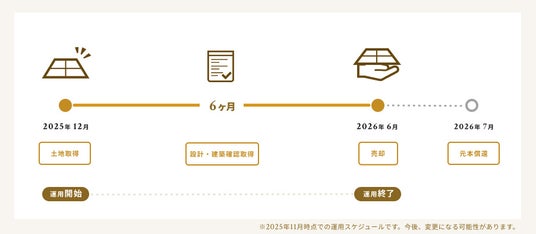 ファンド組成後、複合型ホーム1棟および障がい者グループホーム1棟の設計を行い、建築確認を取得、運用終了時には福祉施設用地として売却して、配当金支払および元本償還を行います。