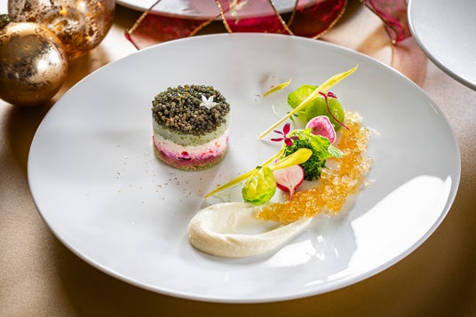 料理長 徳留が厳選した松阪牛や、フォアグラ、伊勢海老、鮑など贅沢な食材をふんだんに使用。目の前で焼き上げる鮑や伊勢海老と、まるでアートのような氷の器に美しく盛り付けた御造里が、対照的で心に残るひとときを演出します。ソムリエが選んだワインや日本酒とのペアリングもご用意。上質な空間の中で、大人のためのクリスマスをぜひご堪能ください。
