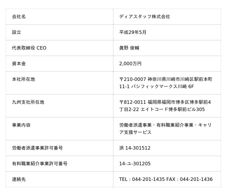 ディアスタッフは、川崎と九州を拠点とする2017年創業の人材派遣・転職支援会社です。経済的な制約から一歩を踏み出せずにいる方々や、未来に漠然とした不安を抱える方に寄り添う人材サービスを提供いたします。私たちは、仕事を通じて誰もが自分を肯定し、安心して過ごせる“居場所”を提供することを目指しています。