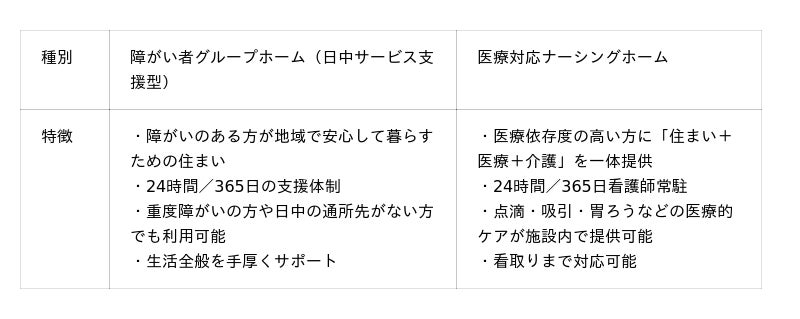 24時間/365日の支援体制を整備した「日中サービス支援型グループホーム」と「医療対応ナーシングホーム」
