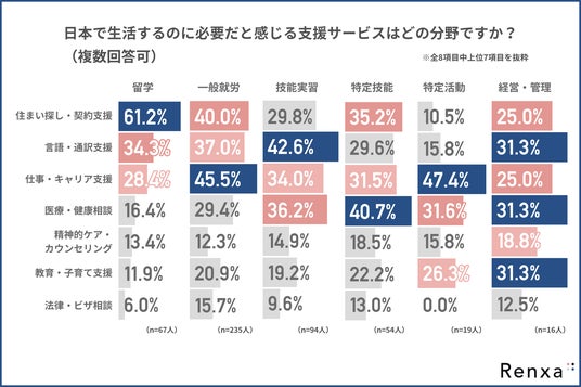 「日本で生活するのに必要だと感じる支援サービスの分野」について尋ねたところ、在留資格別で以下のような回答結果になりました。
