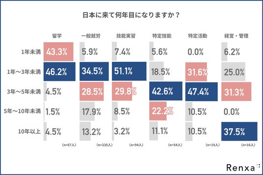 はじめに、「日本に来て何年目になるか」と尋ねたところ、在留資格別で以下のような回答結果になりました。