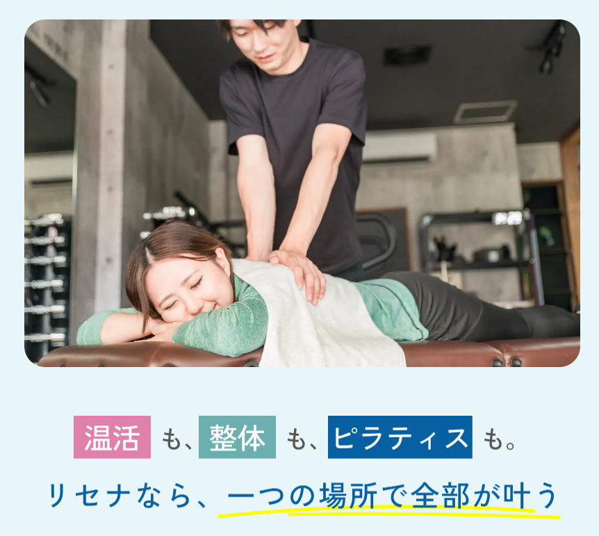 「Risena」では、お客様のニーズに応じたプランをご用意。整体、ピラティス、岩盤浴、ジムエリアなど多様なサービスを組み合わせて利用することができます。