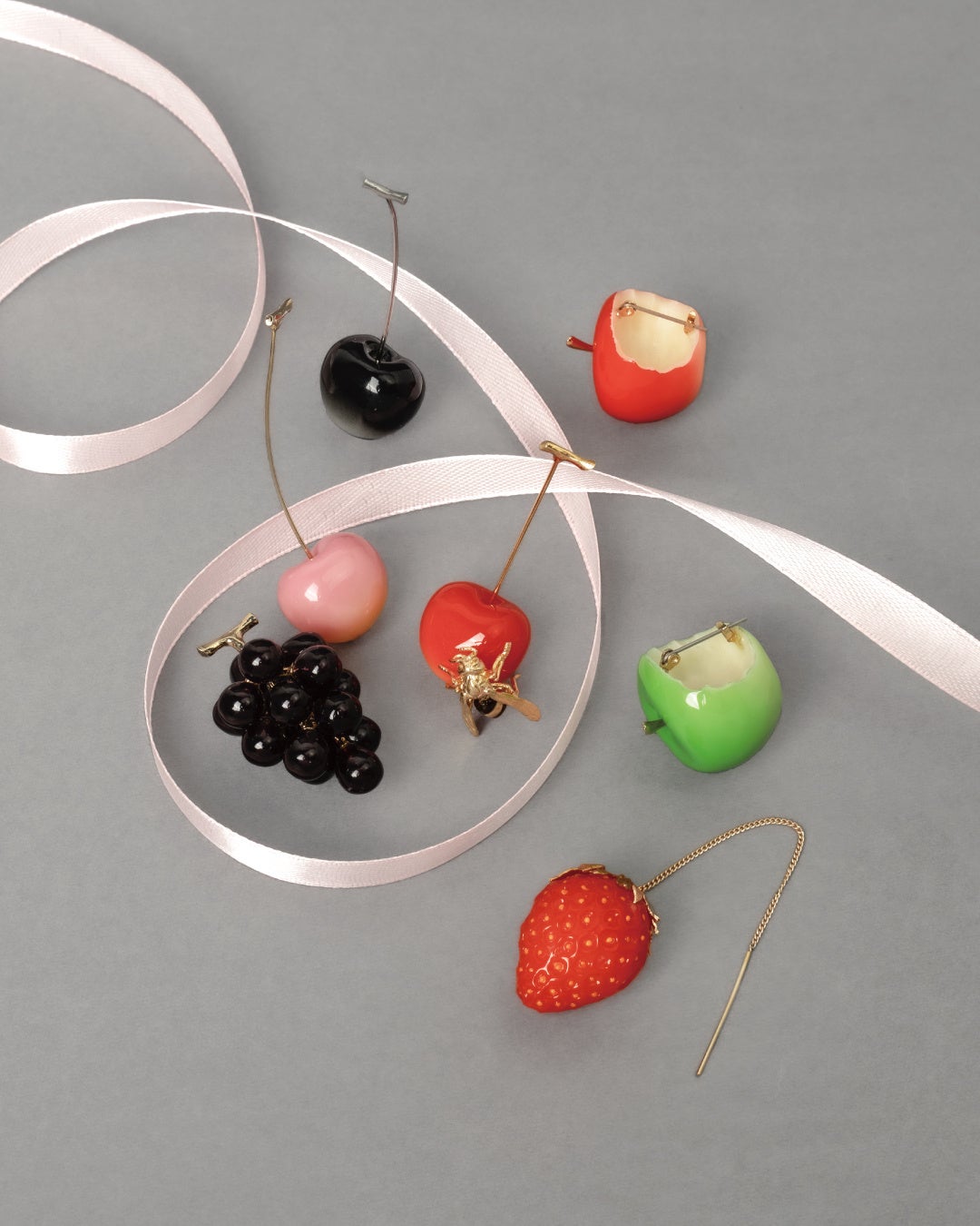 サクランボのヘタやブドウの一粒をキャッチにしたピアスなどのディティールに、デザイナーの遊び心を感じられます。