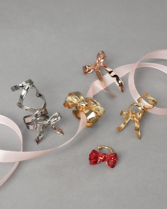 左から レースアップリボンアーマーリング(ロジウムメッキ)¥35,200、リボンリング(ゴールドメッキ)¥23,100、リボンピアス(ピンクゴールドメッキ)¥14,300、レースアップリボンイヤーカフ(ゴールドメッキ)¥23,100、リボンイヤーカフ(レッドカラーメッキ)¥13,200 すべて税込