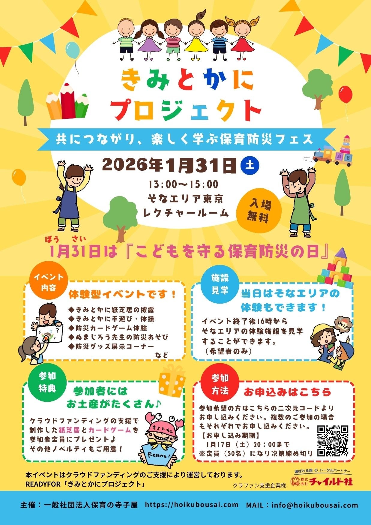 一般社団法人保育の寺子屋(神奈川県横浜市鶴見区、代表理事:藤實智子)は、2026年1月31日の「こどもを守る保育防災の日」と制定し、保育士および子どもに関わる仕事をしている方を対象とした体験型イベント 「きみとかにプロジェクト 保育防災フェス」 を開催します。