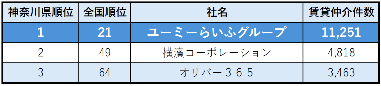 神奈川県上位3社のランキング表