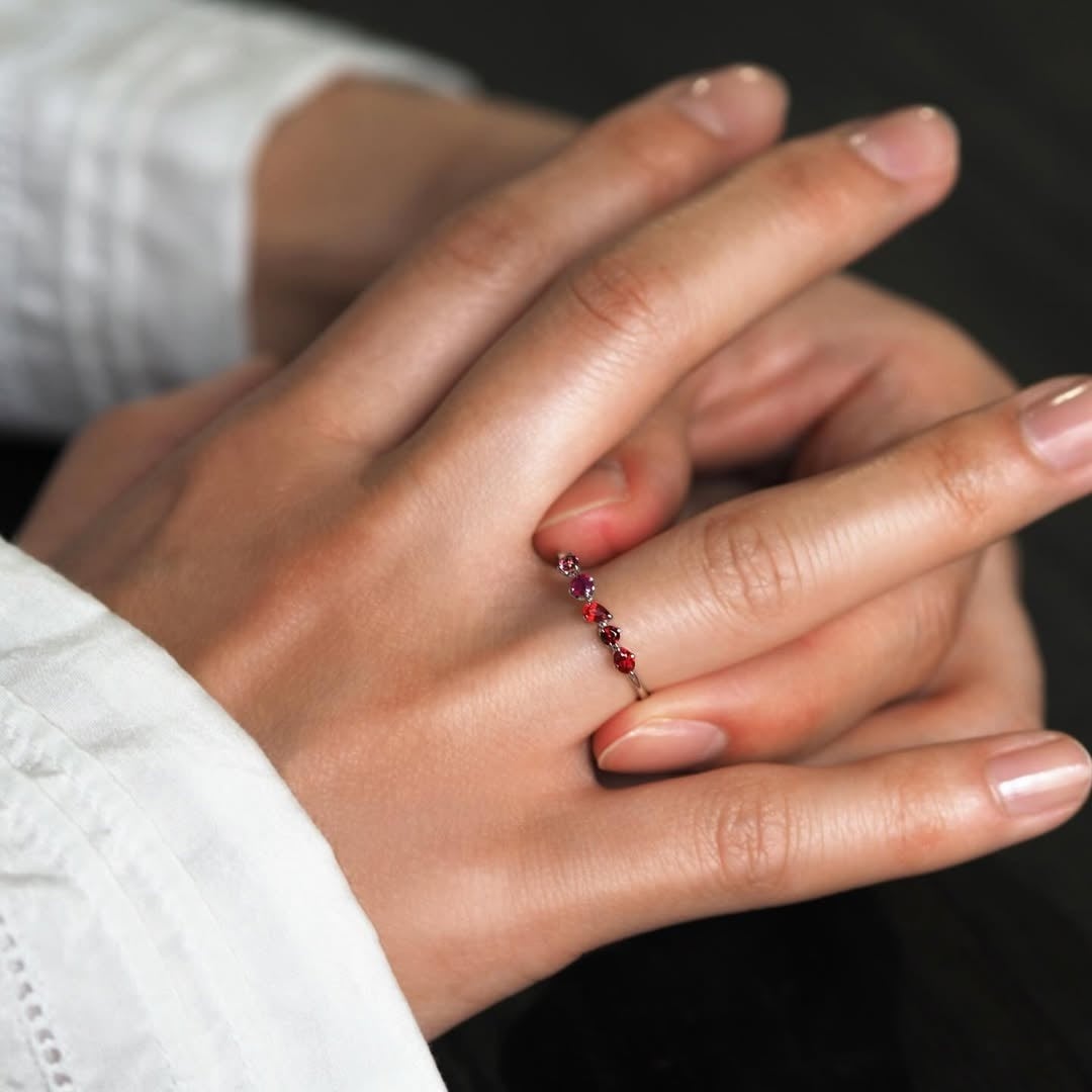 深い赤やピンクを基調にまとめた配色、やわらかなグラデーションを描く組み合わせ、複数の色が連なるリズミカルな表情など、それぞれが異なる印象を持つ一本となっています。淡いピンクダイヤモンドをあしらったデザインでは、グリーンやピンクのサファイアとの組み合わせにより、指元に軽やかな彩りを添える表情もお楽しみいただけます。