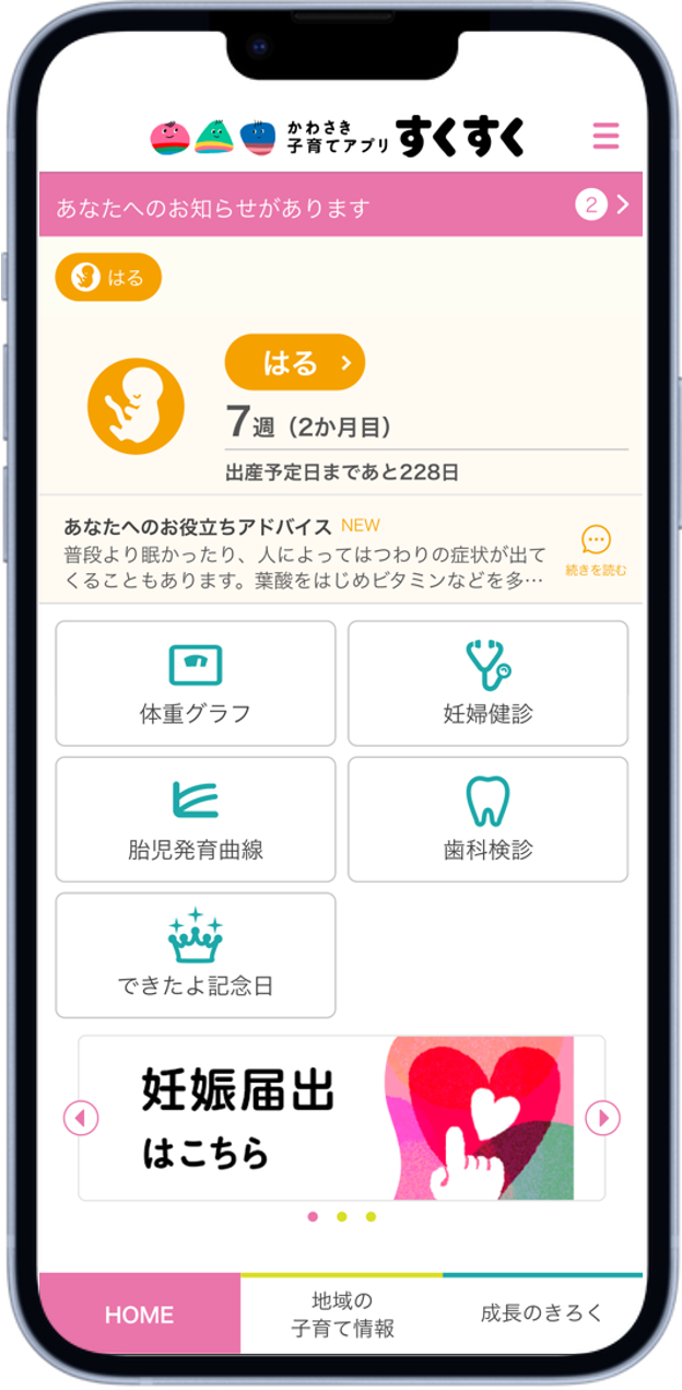 妊娠・出産~子育て期に必要な手続きやイベント・講座を、子どもの年齢や居住区に応じてプッシュ通知でお知らせします。