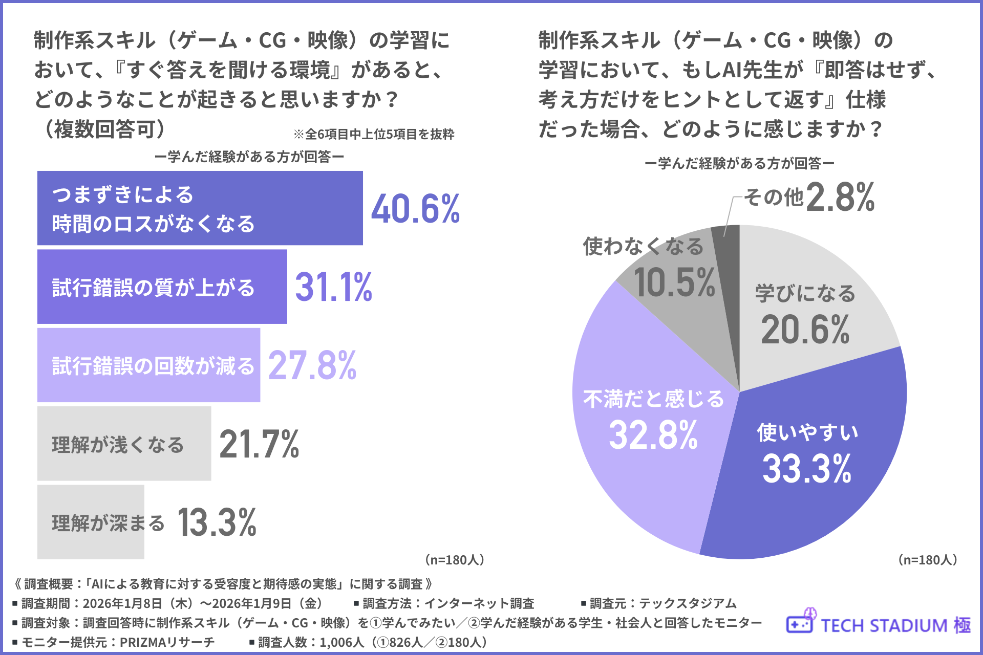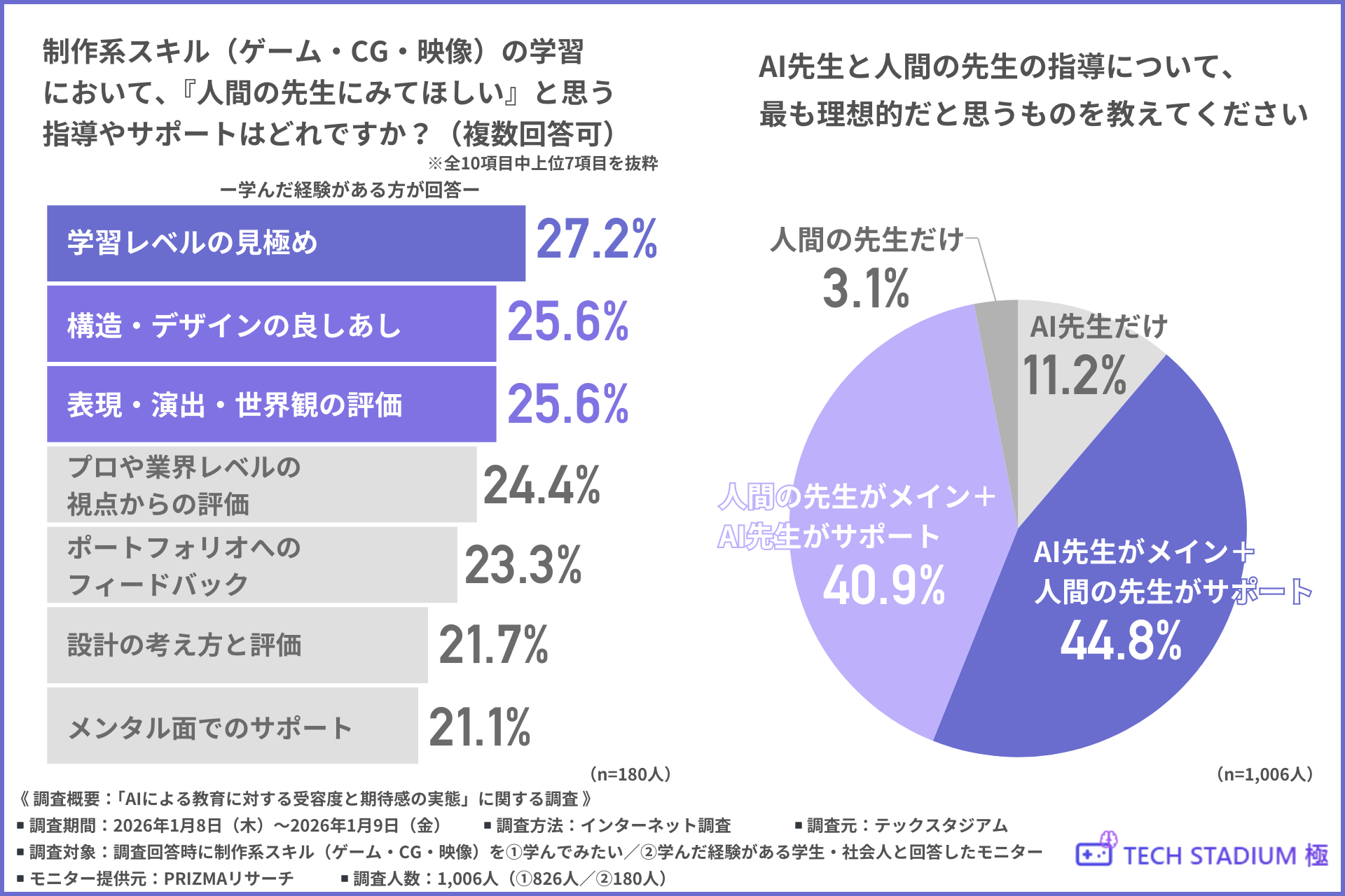 そこで今回、テックスタジアム(https://tech-sta.com/kiwami/)は、制作系スキル(ゲーム・CG・映像)を1.学んでみたい/2.学んだ経験がある学生・社会人を対象に、「AIによる教育に対する受容度と期待感の実態」に関する調査を行いました。