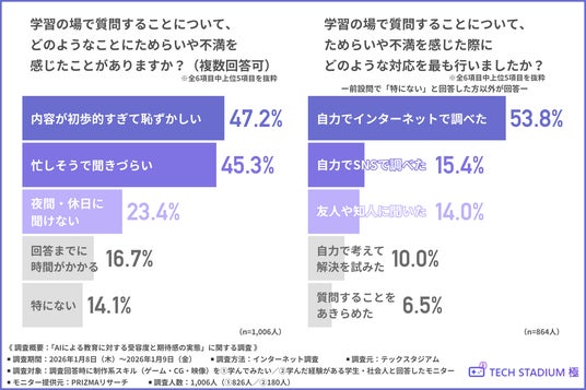 はじめに、「学習の場で質問することについて、どのようなことにためらいや不満を感じたことがあるか」と尋ねたところ、『内容が初歩的すぎて恥ずかしい(47.2%)』と回答した方が最も多く、『忙しそうで聞きづらい(45.3%)』『夜間・休日に聞けない(23.4%)』となりました。
