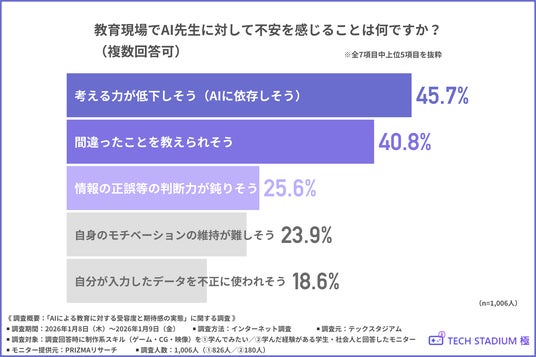 「教育現場でAI先生に対して不安を感じること」について尋ねたところ、『考える力が低下しそう(AIに依存しそう)(45.7%)』と回答した方が最も多く、『間違ったことを教えられそう(40.8%)』『情報の正誤等の判断力が鈍りそう(25.6%)』となりました。