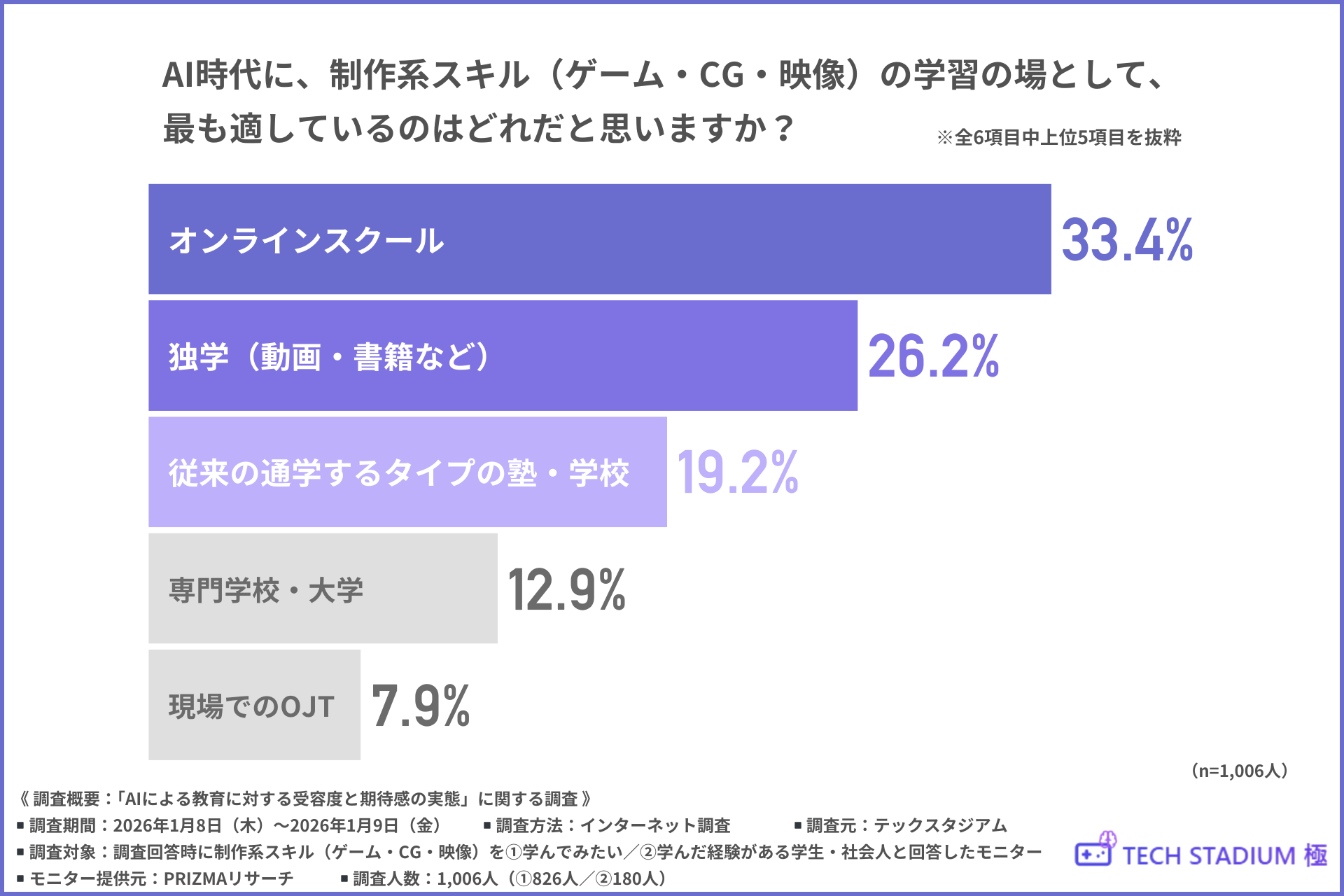 全員に、「AI時代に、制作系スキル(ゲーム・CG・映像)の学習の場として、最も適しているのはどれだと思うか」と尋ねたところ、『オンラインスクール(33.4%)』と回答した方が最も多く、『独学(動画・書籍など)(26.2%)』『従来の通学するタイプの塾・学校(19.2%)』となりました。