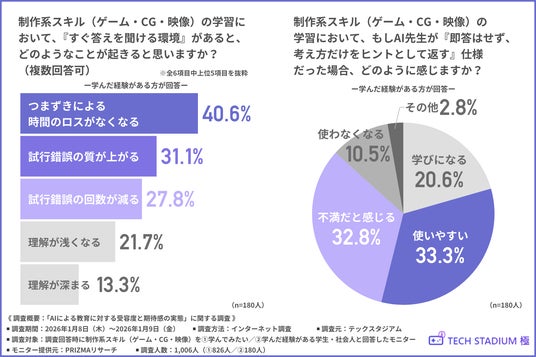 また、制作系スキル(ゲーム・CG・映像)の学習において、「すぐ答えを聞ける環境」があれば、学んだ経験がある方の約4割が「つまずきによる時間のロスがなくなる」、約3割が「試行錯誤の質が上がる」と回答しました。