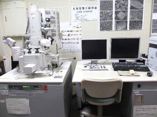 実習は、本学医学部共同実験室に設置している走査型電子顕微鏡「HITACHI S-4800」を使用して行いました。検出器や加速電圧等の条件設定を変更した時の実際の像を比較することで、検出器による電顕像の違いや像障害を軽減するための方法について、実機での確認をしました。その他、機器の使用法やさまざまな便利機能についての説明もありました。