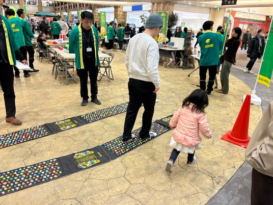 ・ 新聞紙スリッパ制作体験: 災害時にガラスやがれきから足を守る実用的なスキルを、ワークショップ形式で伝授。完成したスリッパで足つぼマットの上を歩き、その保護効果を実感していただきました。