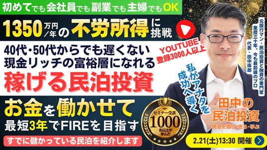 2/21(土)民泊セミナー。40代・50代からでも遅くない。最短3年でFIRE!年間1,350万円のCF・不労所得を目指す!『稼げる民泊YouTube』登録者3000人以上の元銀行マンが伝える