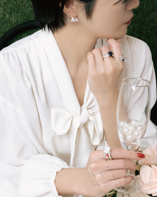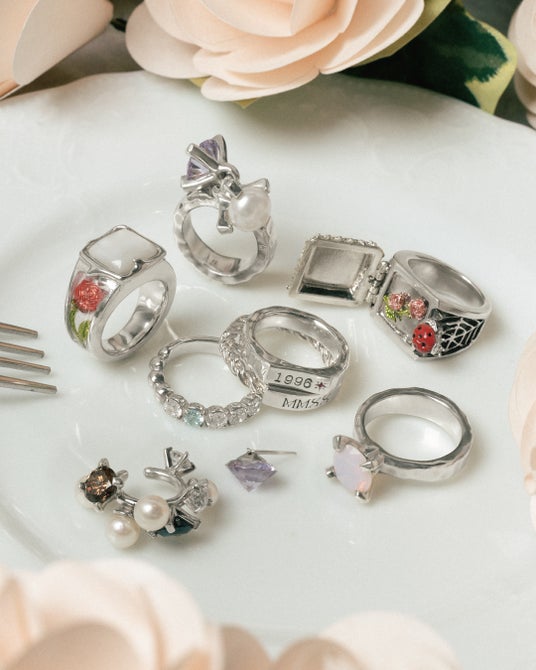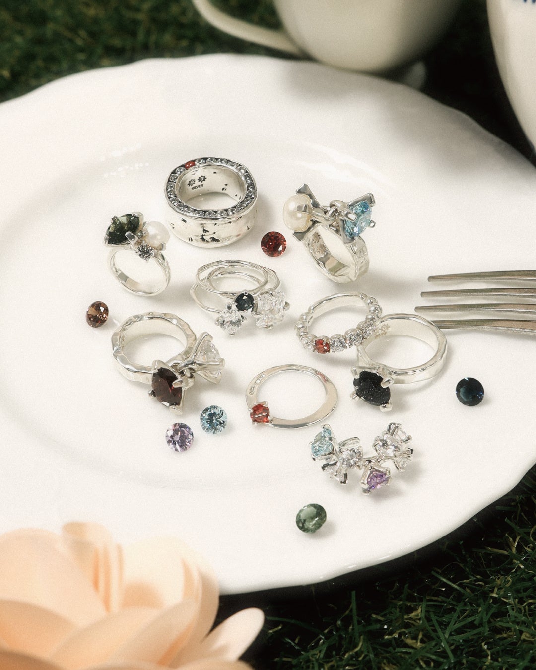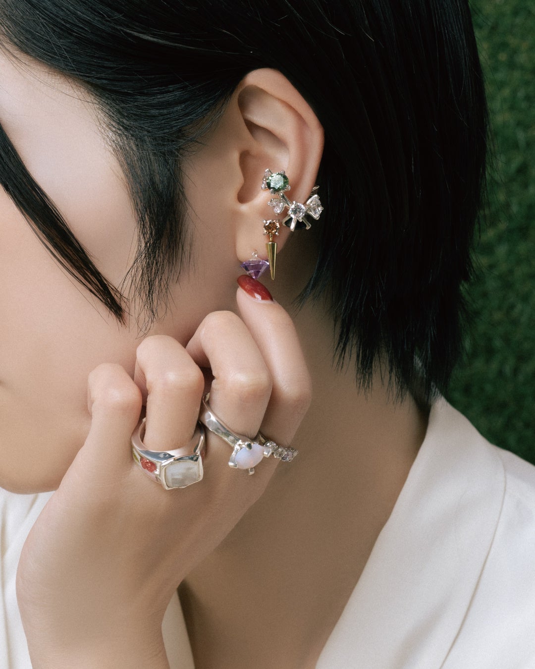 左下から時計回りに リング(シルバー925、キュービックジルコニア)¥42,900、ピンキーリング(シルバー925、キュービックジルコニア、淡水パール)¥39,600、リング(シルバー925、キュービックジルコニア)¥72,600、リング(シルバー925、キュービックジルコニア、淡水パール)¥42,900、3連リング(シルバー925、キュービックジルコニア)¥51,700、リング(シルバー925、キュービックジルコニア)¥36,300、リング(シルバー925、キュービックジルコニア)¥31,900、リング(シルバー925、キュービックジルコニア)¥23,100、イヤーカフ(シルバー925、キュービックジルコニア)¥36,300 すべて税込