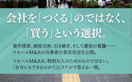 スモールM&Aは決してきれいごとだけではありません。実際に事業を買収してみると、想定外のトラブルにも直面します。それでも私は、個人が経営に挑戦する現実的な選択肢としてスモールM&Aに大きな可能性を感じています。本書では、そのリアルを包み隠さず書きました。