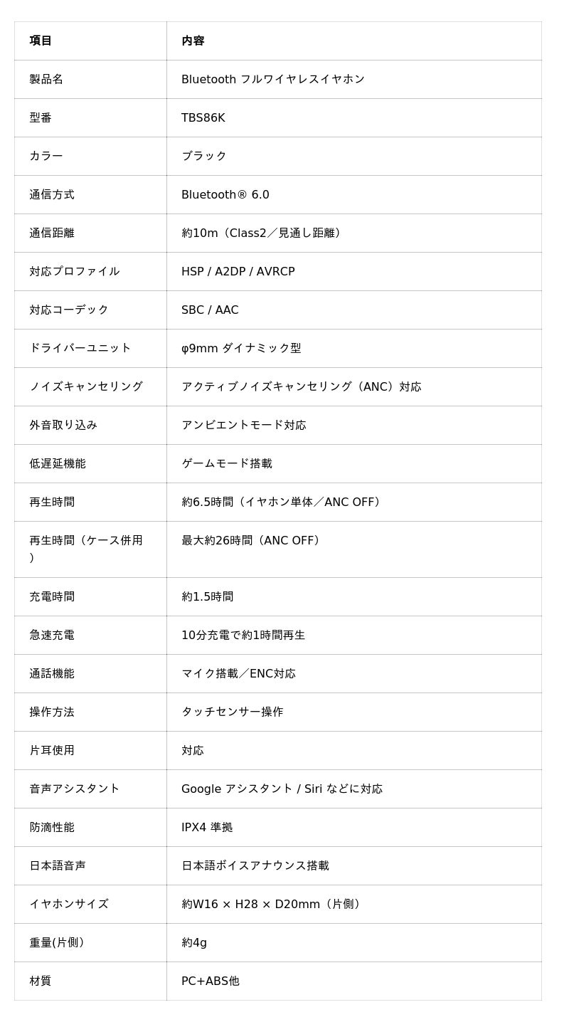 多摩電子工業株式会社(本社:神奈川県川崎市、代表取締役 執行役員社長 杉山一)は、アクティブノイズキャンセリング機能を搭載したBluetooth(R)フルワイヤレスイヤホン 「TBS86K」 を発売いたします。