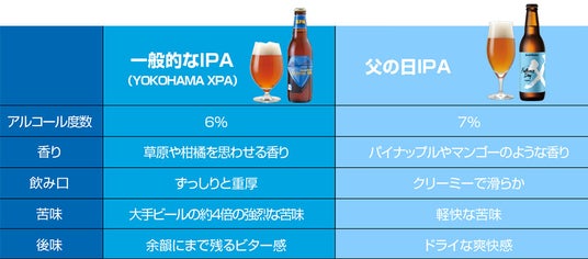 父の日IPAはYOKOHAMA XPAより多くのホップを使いながらも、その投入タイミングを通常の麦汁煮沸“中”ではなく煮沸“後”に集中させることで、ホップの苦味は軽やかでパイナップルや柑橘などのフルーツを思わせるホップアロマを凝縮させたビールになっています。